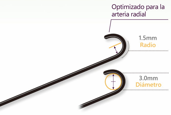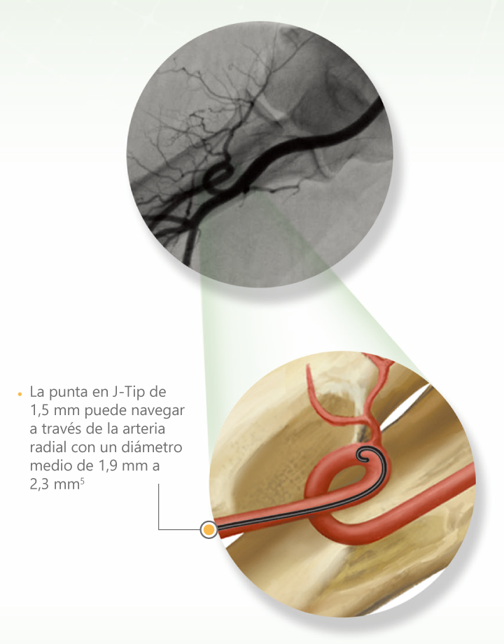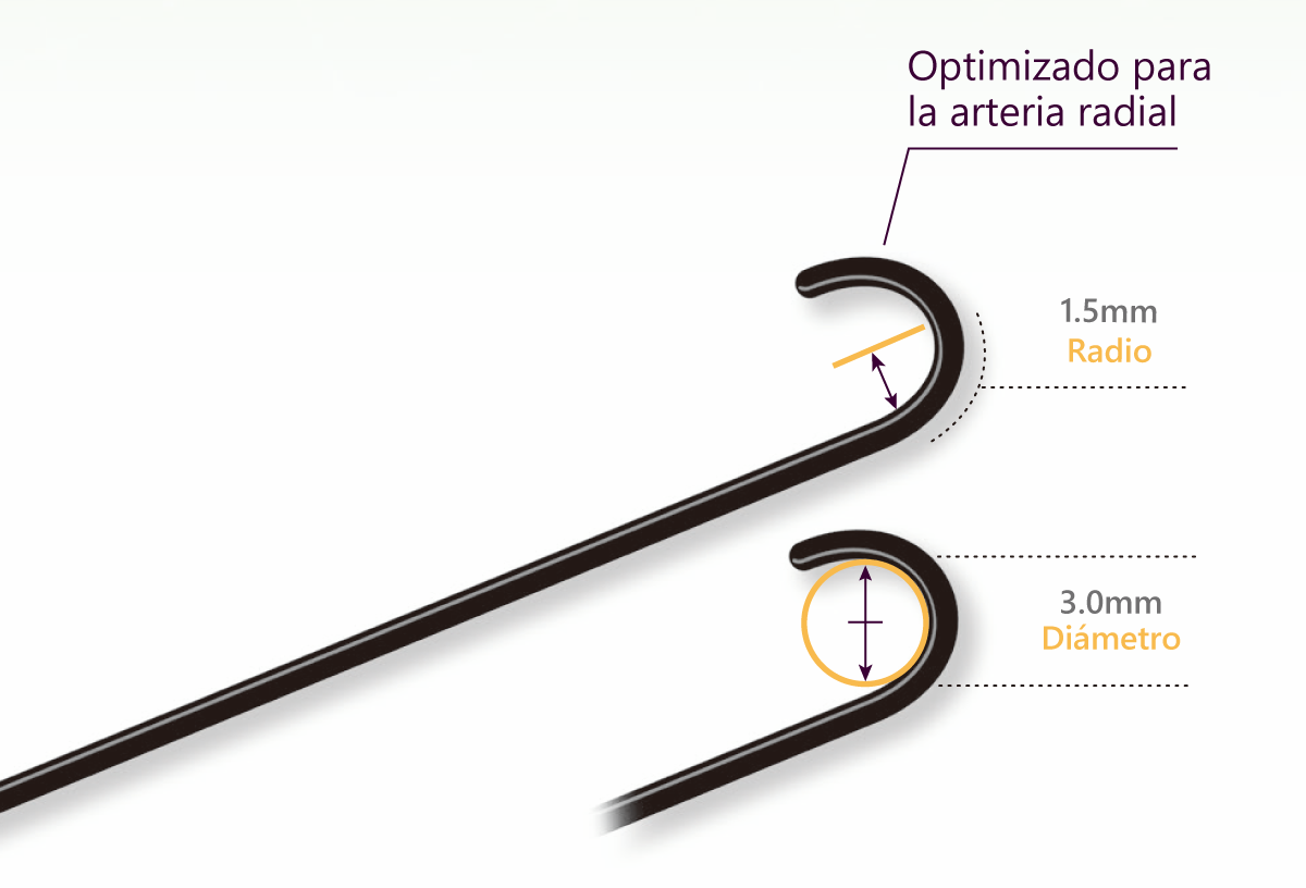 El guía J-Tip está diseñada para evitar ramas laterales de la arteria radial y minimizar el riesgo potencial de perforación y otras complicaciones.
