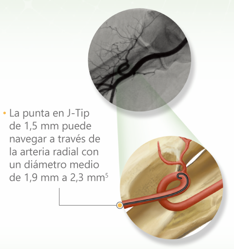 El tamaño compacto y la forma de la punta de la guía en J de 1.5 mm está diseñado para permitir que los médicos naveguen por vasos tortuosos, lo que puede ayudar a minimizar el riesgo de trauma, vasoespasmo e interrupciones del procedimiento.